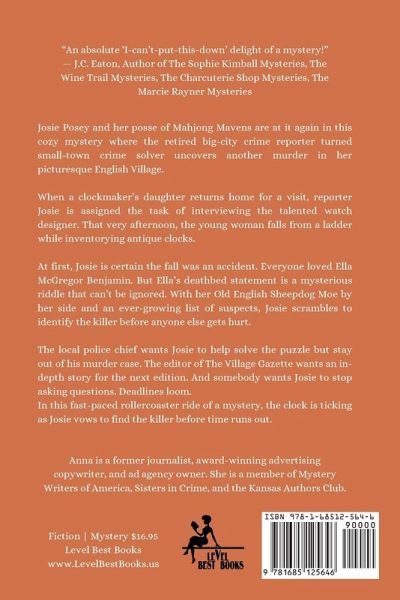 Josie Posey and her posse of Mahjong Mavens are at it again in this cozy mystery where the retired big-city crime reporter turned small-town crime solver uncovers another murder in her picturesque English Village. When a clockmaker's daughter returns home for a visit, reporter Josie is assigned the task of interviewing the talented watch designer. That very afternoon, the young woman falls from a ladder while inventorying antique clocks. At first, Josie is certain the fall was an accident. Everyone loved Ella McGregor Benjamin. But Ella's deathbed statement is a mysterious riddle that can't be ignored. With her Old English Sheepdog Moe by her side and an ever-growing list of suspects, Josie scrambles to identify the killer before anyone else gets hurt. The local police chief wants Josie to help solve the puzzle but stay out of his murder case. The editor of The Village Gazette wants an in-depth story for the next edition. And somebody wants Josie to stop asking questions. Deadlines loom. In this fast-paced rollercoaster ride of a mystery, the clock is ticking as Josie vows to find the killer before time runs out.