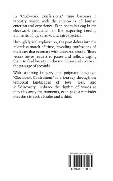 In "Clockwork Confessions," time becomes a tapestry woven with the intricacies of human emotion and experience. Each poem is a cog in the clockwork mechanism of life, capturing fleeting moments of joy, sorrow, and introspection. Through lyrical exploration, the poet delves into the relentless march of time, revealing confessions of the heart that resonate with universal truths. These verses invite readers to pause and reflect, urging them to find beauty in the mundane and solace in the passage of seconds. With stunning imagery and poignant language, "Clockwork Confessions" is a journey through the temporal landscapes of love, loss, and self-discovery. Embrace the rhythm of words as they tick away the moments, each page a reminder that time is both a healer and a thief.
