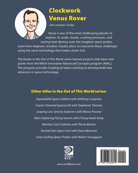Meet NASA inventor Jonathan Sauder! He's here to introduce readers to the clockwork Venus rover, a special spacecraft designed to explore the extreme surface of Venus. Alongside Jonathan, readers will learn about how he and his team designed the rover using clockwork and automaton technology. Students will be introduced to the process of technological design and the importance of space exploration. The Inventor Challenge at the back of the book encourages readers to create their own inventions. For more information about interesting space inventions, check out other titles in the Out of This World series!
