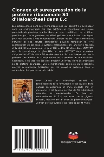 Les extrêmophiles sont des micro-organismes qui peuvent se développer dans les environnements les plus extrêmes et constituent une source potentielle de protéines stables dans de telles conditions. Les protéines produites par ces organismes ont développé des mécanismes spécifiques pour leur solubilité à des concentrations élevées de sel. Il sera intéressant d'étudier si des solutés compatibles peuvent remplacer la forte concentration de sel dans le système haloarchéen sans affecter la fonction et la stabilité des protéines. Le gène HS4 a déjà été cloné dans pTZ57R/T. Ainsi, le sous-clonage du gène HS4 du clone pTZ57R/T dans le vecteur d'expression pET28a (+) a été réalisé avec succès pour l'expression de la protéine. Des études de surexpression de la protéine ont été réalisées. Cependant, il n'a pas été possible d'obtenir un niveau élevé de production de la protéine souhaitée. Une compréhension complète du mécanisme pourrait révolutionner l'utilisation de ces nouvelles protéines dans la recherche et les processus industriels.