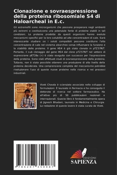 Gli estremofili sono microrganismi che possono prosperare negli ambienti più estremi e costituiscono una potenziale fonte di proteine stabili in tali condizioni. Le proteine prodotte da questi organismi hanno evoluto meccanismi specifici per la loro solubilità ad alte concentrazioni di sale. Sarà interessante studiare se i soluti compatibili possono sostituire l'alta concentrazione di sale nel sistema aloarcheo senza influenzare la funzione e la stabilità delle proteine. Il gene HS4 è già stato clonato in pTZ57R/T. Pertanto, il sub clonaggio del gene HS4 dal clone pTZ57R/T nel vettore di espressione pET28a (+) è stato eseguito con successo per l'espressione della proteina. Sono stati effettuati studi di sovraespressione della proteina. Tuttavia, non è stato possibile ottenere una produzione di alto livello della proteina desiderata. Una comprensione completa del meccanismo potrebbe rivoluzionare l'uso di queste nuove proteine nella ricerca e nei processi industriali.