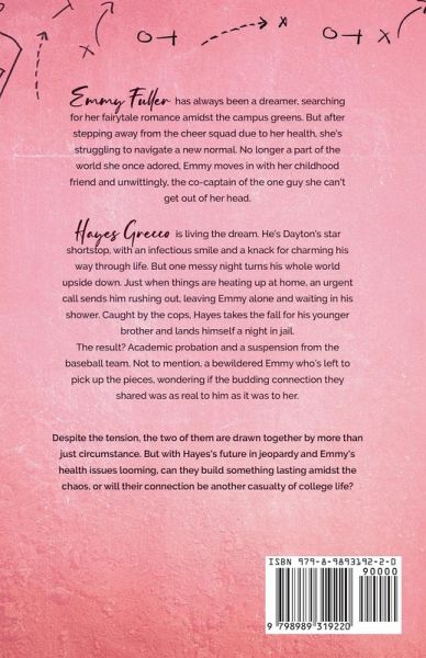 EMMY Fuller has always been a dreamer, searching for her fairytale romance amidst the campus greens. But after stepping away from the cheer squad due to her health, she's struggling to navigate a new normal. No longer a part of the world she once adored, Emmy moves in with her childhood friend and unwittingly, the co-captain of the one guy she can't get out of her head. HAYES Grecco is living the dream. He's Dayton's star shortstop, with an infectious smile and a knack for charming his way through life. But one messy night turns his whole world upside down. Just when things are heating up at home, an urgent call sends him rushing out, leaving Emmy alone and waiting in his shower. Caught by the cops, Hayes takes the fall for his younger brother and lands himself a night in jail. The result? Academic probation and a suspension from the baseball team. Not to mention, a bewildered Emmy who's left to pick up the pieces, wondering if the budding connection they shared was as real to him as it was to her. Despite the tension, the two of them are drawn together by more than just circumstance. But with Hayes's future in jeopardy and Emmy's health issues looming, can they build something lasting amidst the chaos, or will their connection be another casualty of college life?