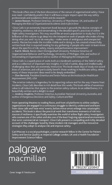"Carl Macrae's Close Calls: Managing Risk and Resilience in Airline Flight Safety is an intimate account of this learning process, broadly framed in relation to the 'High Reliability Organisations' literature. ... Macrae's collated insights constitute an important window into what it means to be working at the frontiers of organisational safety. ... Through his work, safety scholars and risk managers of all types stand to learn from aviation's battle-hardened practices." (John Downer, LSE Review of Books, blogs.lse.ac.uk, May, 2017)