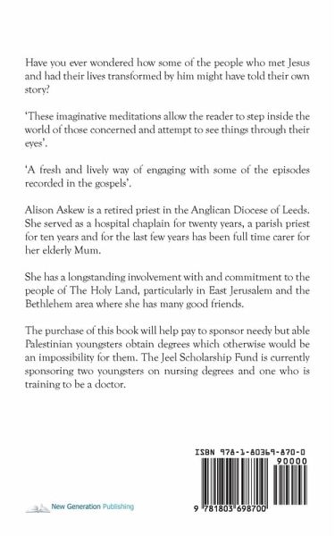 Have you ever wondered how some of the people who met Jesus and had their lives transformed by him might have told their own story? 'These imaginative meditations allow the reader to step inside the world of those concerned and attempt to see things through their eyes'. 'A fresh and lively way of engaging with some of the episodes recorded in the gospels'. Alison Askew is a retired priest in the Anglican Diocese of Leeds. She served as a hospital chaplain for twenty years, a parish priest for ten years and for the last few years has been full time carer for her elderly Mum. She has a longstanding involvement with and commitment to the people of The Holy Land, particularly in East Jerusalem and the Bethlehem area where she has many good friends. The purchase of this book will help pay to sponsor needy but able Palestinian youngsters obtain degrees which otherwise would be an impossibility for them. The Jeel Scholarship Fund is currently sponsoring two youngsters on nursing degrees and one who is training to be a doctor.