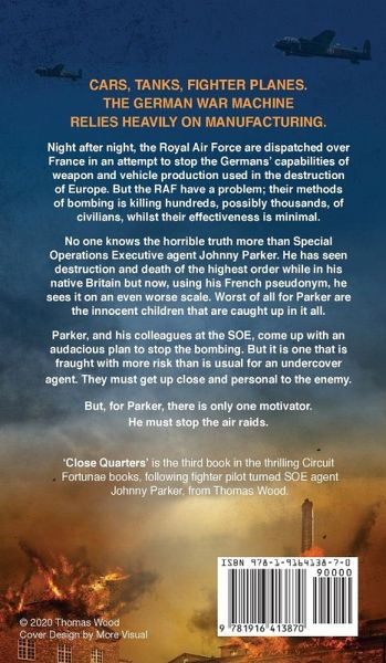 Cars, tanks, fighter planes. The German war machine relies heavily on manufacturing. Night after night, the Royal Air Force are dispatched over France in an attempt to stop the Germans' capabilities of weapon and vehicle production used in the destruction of Europe. But the RAF have a problem; their methods of bombing is killing hundreds, possibly thousands, of civilians, whilst their effectiveness is minimal. No one knows the horrible truth more than Special Operations Executive agent Johnny Parker. He has seen destruction and death of the highest order while in his native Britain but now, using his French pseudonym, he sees it on an even worse scale. Worst of all for Parker are the innocent children that are caught up in it all. Parker, and his colleagues at the SOE, come up with an audacious plan to stop the bombing. But it is one that is fraught with more risk than is usual for an undercover agent. They must get up close and personal to the enemy. But, for Parker, there is only one motivator. He must stop the air raids. 'Close Quarters' is the third book in the thrilling Circuit Fortunae books, following fighter pilot turned SOE Agent Johnny Parker from Thomas Wood. Perfect for fans of gritty WW2 Fiction like Chris Glatte, Rob Lofthouse and Max Hennessy.