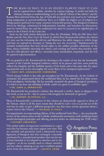 The Mass of Paul VI is so deeply flawed that it cannot be repaired from within, whether by copious helpings of smells and bells, by arbitrary attempts at traditionalizing, or by an official "reform of the reform"; and the Roman Mass inherited from the Age of Faith did not (and does not) need to be "reformed" along antiquarian or pastoral-utilitarian lines, as it fulfills the highest act of religion in a fitting manner perfected over many centuries of prayerful practice. The liturgical revolution, driven by ideology, culminated in balkanization, banality, and boredom; its fabrications must be retired from use, and the traditional rite must be restored to its rightful place of honor in the Church of the Latin rite. Such are the bold claims defended in Close the Workshop: Why the Old Mass Isn't Broken and the New Mass Can't Be Fixed, in which Peter Kwasniewski refutes the reformers' own case for reforming the old rite and illustrates the subtle dangers to which clergy and laity are exposed by attempts at "doing the new rite reverently." Simultaneously he reminds traditionalists that they should aspire to the noblest possible celebration of the Mass, always faithfully observing the rubrics and resisting bad habits that interfere with the rite's full splendor and efficacy: unseemly haste, minimalism, ineptitude, and the itch for pastoral experimentation. If the Catholic Church in the West is ever to recover her internal soundness and external cultural influence, her shepherds and her flocks must let the ill-advised Council of the 1960s and the Bauhaus liturgy cobbled together in its name lapse into obsolescence, so that the perennially fresh theology of the Council of Trent and the immortally beautiful liturgy of the Roman Church may once again flourish unfettered.