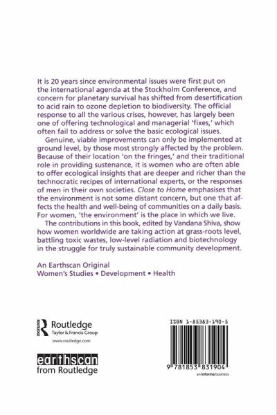 It is 20 years since environmental issues were first put on the international agenda at the Stockholm Conference, and concern for planetary survival has shifted from desertification to acid rain to ozone depletion to biodiversity. The official responses to all the various crises, however, has largely been one of offering technological and managerial 'fixes,' which often fail to address or solve the basic ecological issues. Genuine, viable improvements can only be implemented at ground level, by those most strongly affected by the problem. Because of their location 'on the fringes,' and their traditional role in providing sustenance, it is women who are often able to offer ecological insights that are deeper and richer than the technocratic recipes of international experts, or the responses of men in their own societies. Close to Home emphasises that the environment is not some distant concern, but one that affects the health and well-being of communities on a daily basis. For women, 'the environment' is the place in which we live. The contributions in this book, edited by Vandana Shiva, show how women worldwide are taking action at grass-roots level, battling toxic wastes, low-level radiation and biotechnology in the struggle for truly sustainable community development.