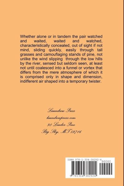 Complex, densely textured literary novel, constructed somewhat roughly around a tornado, a mountain lion attack, and several other alternative potentialities, set in Cathar County, Nebraska sometime in the recent past, or present, or perhaps the future. Featuring characters named Faith and A. Jacks and Arch and Parrish and May and Hanratty and Helen and Horton, and others too many to mention, none of whom are less real than any other reality. Faith seeks recovery of a twin captured by a big cat. Arch seeks an elusive frequency. A. Jacks seeks to re-construct a palace collapsed by cyclone. Parrish seeks deliverance in the coming apocalypse. A two million dollar accidental death insurance benefit hangs in the balance. Stream of consciousness constructs a beginning, a middle, and an end.