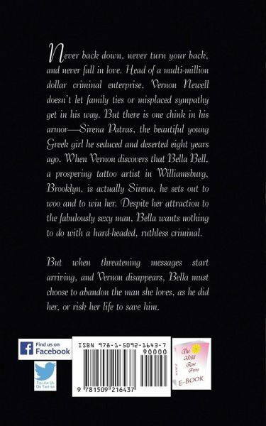 Never back down, never turn your back, and never fall in love. Head of a multi-million dollar criminal enterprise, Vernon Newell doesn’t let family ties or misplaced sympathy get in his way. But there is one chink in his armor—Sirena Patras, the beautiful young Greek girl he seduced and deserted eight years ago. When Vernon discovers that Bella Bell, a prospering tattoo artist in Williamsburg, Brooklyn, is actually Sirena, he sets out to woo and to win her. Despite her attraction to the fabulously sexy man, Bella wants nothing to do with a hard-headed, ruthless criminal. But when threatening messages start arriving, and Vernon disappears, Bella must choose to abandon the man she loves, as he did her, or risk her life to save him.