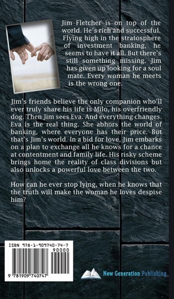 Jim Fletcher is on top of the world. He's rich and successful. Flying high in the stratosphere of investment banking, he seems to have it all. But there's still something missing. Jim has given up looking for a soul mate. Every woman he meets is the wrong one. Jim's friends believe the only companion who'll ever truly share his life is Milo, his overfriendly dog. Then Jim sees Eva. And everything changes. Eva is the real thing. She abhors the world of banking, where everyone has their price. But that's Jim's world. In a bid for love, Jim embarks on a plan to exchange all he knows for a chance at contentment and family life. His risky scheme brings home the reality of class divisions but also unlocks a powerful love between the two. How can he ever stop lying, when he knows that the truth will make the woman he loves despise him?