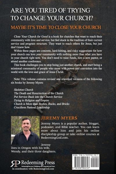 Close Your Church for Good is a book for churches that want to reach their community with love and service, but feel stuck in the tradition of their current service and program structure. They want to reach others for Jesus, but just don’t know how. Within these pages are concrete, hard-hitting, and risky suggestions for how your church can love your community with nothing more than what you have in your church right now. You don’t need to raise funds, hire a new pastor, or attend another conference. This book challenges you to stop being just another church, and start being a missional community of people who move with power and conviction into the world with the love and grace of Jesus Christ. This volume contains revised and reworked versions of the following six books by Jeremy Myers: Skeleton Church The Death and Resurrection of the Church Put Service Back into the Church Service Dying to Religion and Empire Church is More than Bodies, Bucks, and Bricks Cruciform Pastoral Leadership