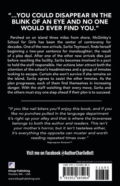 "...you could disappear in the blink of an eye and no one would ever find you." Perched on an island three miles from shore, McGinley's School for Girls has been the center of controversy for decades. One of the new arrivals, Sarita Teymouri, finds herself beginning a two-year sentence for manslaughter; the result of a plea deal. After one of the other new arrivals dies just before reaching the facility, Sarita becomes involved in a pact to hold the staff responsible. Her actions later attract both the attention of the school's headmistress and a group of inmates looking to escape. Certain she won't survive if she remains on the island, Sarita agrees to assist the other inmates. As the plan progresses, each of them find themselves in increasing danger. With the staff watching their every move, Sarita and the others must stay one step ahead if their plan is to succeed. "If you like nail biters you'll enjoy this book, and if you like no punches pulled in the language department it's right up your alley and that is where the braveness belongs to both the author and readers. This isn't your mother's horror, but it isn't tasteless either, it's everything the opposite can muster and worth reading repeated times over." - Reprospace Reviews