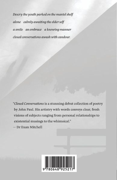 Descry the youth parked on the mantel shelf alone calmly awaiting the elder self a smile an embrace a knowing manner closed conversations awash with candour. Closed Conversations is the timeless exchange between an elder and his eight-year-old self. A warm and deeply personal discourse of the journey ahead, what lies within and the Contract of Life ignored, until now.