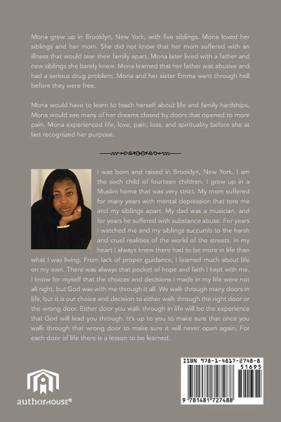 Mona grew up in Brooklyn, New York, with five siblings. Mona loved her siblings and her mom. She did not know that her mom suffered with an illness that would tear their family apart. Mona later lived with a father and new siblings she barely knew. Mona learned that her father was abusive and had a serious drug problem. Mona and her sister Emma went through hell before they were free. Mona would have to learn to teach herself about life and family hardships. Mona would see many of her dreams closed by doors that opened to more pain. Mona experienced life, love, pain, loss, and spirituality before she at last recognized her purpose.