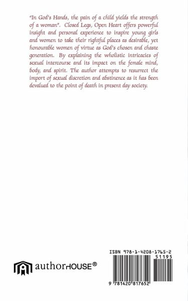 "In God's Hands, the pain of a child yields the strength of a woman". Closed Legs, Open Heart offers powerful insight and personal experience to inspire young girls and women to take their rightful places as desirable, yet honourable women of virtue as God's chosen and chaste generation. By explaining the wholistic intricacies of sexual intercourse and its impact on the female mind, body, and spirit. The author attempts to resurrect the import of sexual discretion and abstinence as it has been devalued to the point of death in present day society.