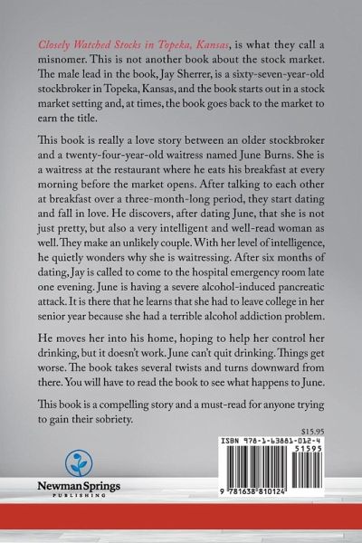 Closely Watched Stocks in Topeka, Kansas, is what they call a misnomer. This is not another book about the stock market. The male lead in the book, Jay Sherrer, is a sixty-seven-year-old stockbroker in Topeka, Kansas, and the book starts out in a stock market setting and, at times, the book goes back to the market to earn the title. This book is really a love story between an older stockbroker and a twenty-four-year-old waitress named June Burns. She is a waitress at the restaurant where he eats his breakfast at every morning before the market opens. After talking to each other at breakfast over a three-month-long period, they start dating and fall in love. He discovers, after dating June, that she is not just pretty, but also a very intelligent and well-read woman as well. They make an unlikely couple. With her level of intelligence, he quietly wonders why she is waitressing. After six months of dating, Jay is called to come to the hospital emergency room late one evening. June is having a severe alcohol-induced pancreatic attack. It is there that he learns that she had to leave college in her senior year because she had a terrible alcohol addiction problem. He moves her into his home, hoping to help her control her drinking, but it doesn't work. June can't quit drinking. Things get worse. The book takes several twists and turns downward from there. You will have to read the book to see what happens to June. This book is a compelling story and a must-read for anyone trying to gain their sobriety.