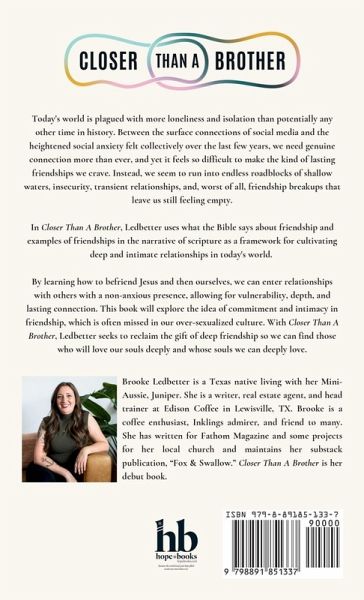 Today's world is plagued with more loneliness and isolation than potentially any other time in history. Between the surface connections of social media and the heightened social anxiety felt collectively over the last few years, we need genuine connection more than ever, and yet it feels so difficult to make the kind of lasting friendships we crave. Instead, we seem to run into endless roadblocks of shallow waters, insecurity, transient relationships, and, worst of all, friendship breakups that leave us still feeling empty. In Closer Than A Brother, Ledbetter uses what the Bible says about friendship and examples of friendships in the narrative of scripture as a framework for cultivating deep and intimate relationships in today's world. By learning how to befriend Jesus and then ourselves, we can enter relationships with others with a non-anxious presence, allowing for vulnerability, depth, and lasting connection. This book will explore the idea of commitment and intimacy in friendship, which is often missed in our over-sexualized culture. With Closer Than A Brother, Ledbetter seeks to reclaim the gift of deep friendship so we can find those who will love our souls deeply and whose souls we can deeply love.