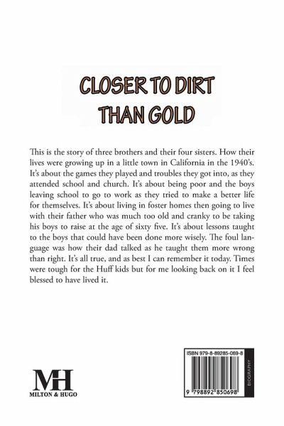This is the story of three brothers and their four sisters. How their lives were growing up in a little town in California in the 1940's. It's about the games they played and troubles they got into, as they attended school and church. It's about being poor and the boys leaving school to go to work as they tried to make a better life for themselves. It's about living in foster homes then going to live with their father who was much too old and cranky to be taking his boys to raise at the age of sixty-five. It's about lessons taught to the boys that could have been done more wisely. The foul language was how their dad talked as he taught them more wrong than right. It's all true, and as best I can remember it today. Times were tough for the Huff kids but for me looking back on it I feel blessed to have lived it.