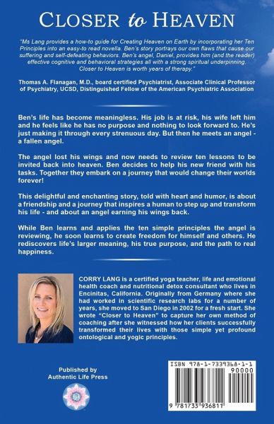 Ben’s life has become meaningless. His job is at risk, his wife left him and he feels like he has no purpose and nothing to look forward to. He’s just making it through every strenuous day. But then he meets an angel - a fallen angel. The angel lost his wings and now needs to review ten lessons to be invited back into heaven. Ben decides to help his new friend with his tasks. Together they embark on a journey that would change their worlds forever! This delightful and enchanting story, told with heart and humor, is about a friendship and a journey that inspires a human to step up and transform his life - and about an angel earning his wings back. While the human learns and applies ten simple principles the angel is teaching him, he soon learns to create freedom for himself and others. He rediscovers life’s larger meaning, his true purpose, and the path to real happiness. "Ms Lang provides a how-to guide for Creating Heaven on Earth by incorporating her Ten Principles into an easy-to read novella. Ben’s story portrays our own flaws that cause our suffering and self-defeating behaviors. Ben’s angel, Daniel, provides him (and the reader) effective cognitive and behavioral strategies all with a strong spiritual underpinning. Closer to Heaven is worth years of therapy." - Thomas A. Flanagan, M.D., board certified Psychiatrist Corry Lang is a certified yoga teacher and a life and emotional health coach. She wrote "Closer to Heaven" to capture her own method of coaching after she witnessed how her clients successfully transformed their lives with those simple yet profound ontological and yogic principles.