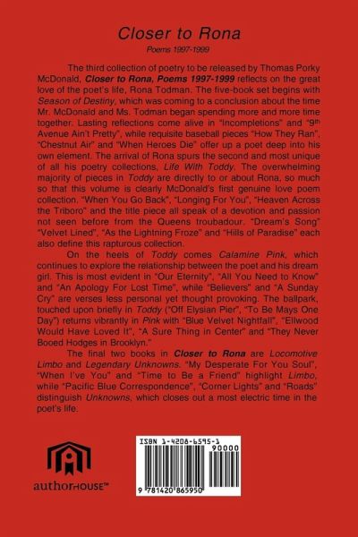 Closer to Rona Poems 1997-1999 The third collection of poetry to be released by Thomas Porky McDonald, Closer to Rona, Poems 1997-1999 reflects on the great love of the poet''s life, Rona Todman. The five-book set begins with Season of Destiny, which was coming to a conclusion about the time Mr. McDonald and Ms. Todman began spending more and more time together. Lasting reflections come alive in "Incompletions" and "9th Avenue Ain''t Pretty", while requisite baseball pieces "How They Ran", "Chestnut Air" and "When Heroes Die" offer up a poet deep into his own element. The arrival of Rona spurs the second and most unique of all his poetry collections, Life With Toddy. The overwhelming majority of pieces in Toddy are directly to or about Rona, so much so that this volume is clearly McDonald''s first genuine love poem collection. "When You Go Back", "Longing For You", "Heaven Across the Triboro" and the title piece all speak of a devotion and passion not seen before from the Queens troubadour. "Dream''s Song" "Velvet Lined", "As the Lightning Froze" and "Hills of Paradise" each also define this rapturous collection. On the heels of Toddy comes Calamine Pink, which continues to explore the relationship between the poet and his dream girl. This is most evident in "Our Eternity", "All You Need to Know" and "An Apology For Lost Time", while "Believers" and "A Sunday Cry" are verses less personal yet thought provoking. The ballpark, touched upon briefly in Toddy ("Off Elysian Pier", "To Be Mays One Day") returns vibrantly in Pink with "Blue Velvet Nightfall", "Ellwood Would Have Loved It", "A Sure Thing in Center" and "They Never Booed Hodges in Brooklyn." The final two books in Closer to Rona are Locomotive Limbo and Legendary Unknowns. "My Desperate For You Soul", "When I''ve You" and "Time to Be a Friend" highlight Limbo, while "Pacific Blue Correspondence", "Corner Lights" and "Roads" distinguish Unknowns, which closes out a most electric time in the poet''s life.