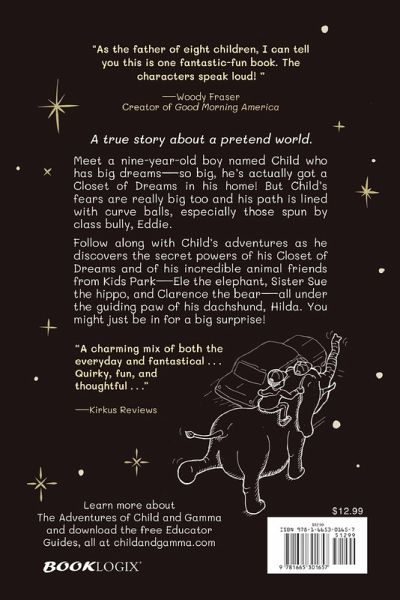 Gold Medal Winner, 2024 Moonbeam Children's Book Awards, Juvenile Fiction/Early Reader A true story about a pretend world.Meet a nine-year-old boy named Child who has big dreams-so big, he's actually got a Closet of Dreams in his home! But Child's fears are really big too, and his path is lined with curve balls, especially those spun by class bully, Eddie.Follow along with Child's adventures as he discovers the secret powers of his Closet of Dreams and of his incredible animal friends from Kids Park-Ele the elephant, Sister Sue the hippo, and Clarence the bear-all under the guiding paw of Hilda the dachshund. You might just be in for a surprise!