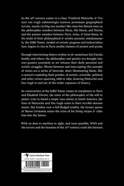 As the 19th century comes to a close, Friedrich Nietzsche and Vincent van Gogh unknowingly traverse proximate geographical terrain, nearly circling one another like close but distant stars as the philosopher wanders between Nizza, Sils Maria, and Torino, and the painter wanders between Paris, Arles, and Saint-Rémy. In the midst of their philosophical and artistic pursuits, simultaneously, the Eiffel Tower, symbol of artistic progress and industrialization, begins to rise in Paris amidst clamors of protest and praise. Through intertwining letters written to (& sometimes by) friends, family, and others, the philosopher and painter are brought into ever-greater proximity as we witness their daily personal and artistic struggles. Woven between and interrupting this panoply of voices are a series of intervals, short illuminating blasts, like a camera's exploding flash powder, of artistic, scientific, political, and other events spanning 1888 to 1890, drawing Nietzsche and Van Gogh in and out of the wider expanses of history. As construction of the Eiffel Tower comes to completion in Paris and Elisabeth Förster, the sister of the philosopher of the will to power, tries to found a utopic race colony in South America, the lives of Nietzsche and Van Gogh come to their terrible denouements. Her brother now a full-fledged zombie, the former queen of Nueva Germania seizes the reins of his living corpse and rides him into the future. With no deus ex machina in sight, and none possible, WWI and the terrors and the beauties of the 20th century crack the horizon.