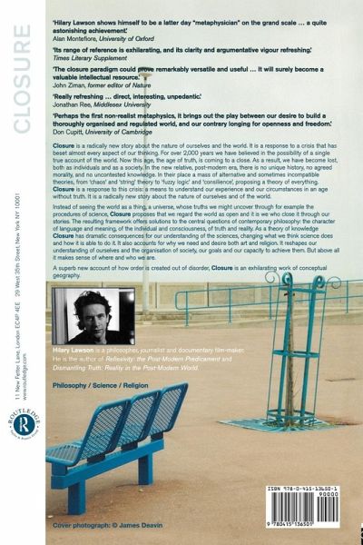 For over 2000 years our culture has believed in the possibility of a single true account of the world. Now this age is coming to a close. As a result there is a deep unease. We are lost both as individuals, and as a culture. In the new relativistic, post-modern era, we have no history, no right or moral action, and no body of knowledge. In their place is a plethora of alternative, and sometimes incompatible theories from 'fuzzy logic' to 'consilience' proposing a theory of everything. Closure is a response to this crisis. It is a radically new story about the nature of ourselves and of the world.