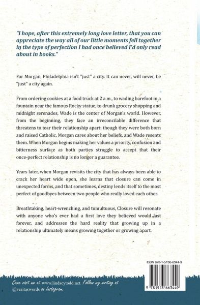 "I hope, after this extremely long love letter, that you can appreciate the way all of our little moments fell together in the type of perfection I had once believed I'd only read about in books." For Morgan, Philadelphia isn't "just" a city. It can never, will never, be "just" a city again. From ordering cookies at a food truck at 2 AM, to wading barefoot in a fountain near the famous Rocky statue, to drunk grocery shopping and midnight serenades, Wade is the center of Morgan's world. However, from the beginning, they face an irreconcilable difference that threatens to tear their relationship apart: though they were both born and raised Catholic, Morgan cares about her beliefs, and Wade resents them. When Morgan begins making her values a priority, confusion and bitterness surface as both parties struggle to accept that their once-perfect relationship is no longer a guarantee. Years later, when Morgan revisits the city that has always been able to crack her heart wide open, she learns that closure can come in unexpected forms, and that sometimes, destiny lends itself to the most perfect of goodbyes between two people who really loved each other. Breathtaking, heart-wrenching, and tumultuous, Closure will resonate with anyone who's ever had a first love they believed would last forever, and addresses the hard reality that growing up in a relationship ultimately means growing together or growing apart.