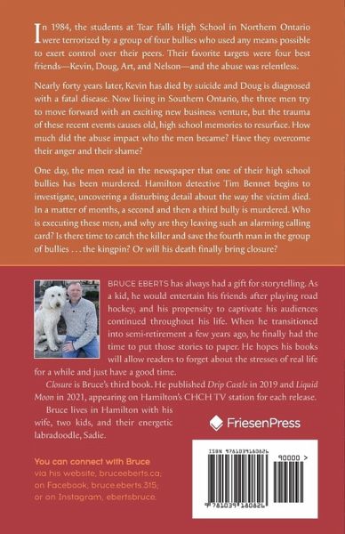 In 1984, the students at Tear Falls High School in Northern Ontario were terrorized by a group of four bullies who used any means possible to exert control over their peers. Their favorite targets were four best friends-Kevin, Doug, Art, and Nelson-and the abuse was relentless. Nearly forty years later, Kevin has died by suicide and Doug is diagnosed with a fatal disease. Now living in Southern Ontario, the three men try to move forward with an exciting new business venture, but the trauma of these recent events causes old, high school memories to resurface. How much did the abuse impact who the men became? Have they overcome their anger and their shame? One day, the men read in the newspaper that one of their high school bullies has been murdered. Hamilton detective Tim Bennet begins to investigate, uncovering a disturbing detail about the way the victim died. In a matter of months, a second and then a third bully is murdered. Who is executing these men, and why are they leaving such an alarming calling card? Is there time to catch the killer and save the fourth man in the group of bullies . . . the kingpin? Or will his death finally bring closure?