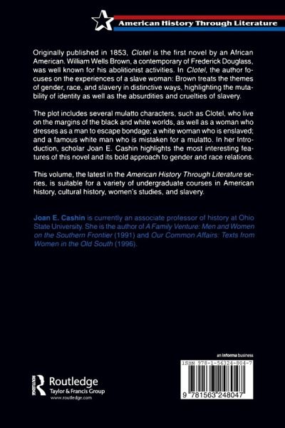 Originally published in 1853, Clotel is the first novel by an African American. William Wells Brown, a contemporary of Frederick Douglass, was well known for his abolitionist activities. In Clotel, the author focuses on the experiences of a slave woman: Brown treats the themes of gender, race, and slavery in distinctive ways, highlighting the mutability of identity as well as the absurdities and cruelties of slavery. The plot includes several mulatto characters, such as Clotel, who live on the margins of the black and white worlds, as well as a woman who dresses as a man to escape bondage; a white woman who is enslaved; and a famous white man who is mistaken for a mulatto. In her Introduction, scholar Joan E. Cashin highlights the most interesting features of this novel and its bold approach to gender and race relations. This volume, the latest in the American History Through Literature series, is suitable for a variety of undergraduate courses in American history, cultural history, women's studies, and slavery.