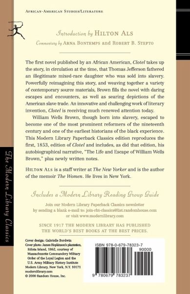 The first novel published by an African American, Clotel takes up the story, in circulation at the time, that Thomas Jefferson fathered an illegitimate mulatto daughter who was sold into slavery. Powerfully reimagining this story, and weaving together a variety of contemporary source materials, Brown fills the novel with daring escapes and encounters, as well as searing depictions of the American slave trade. An innovative and challenging work of literary invention, Clotel is receiving much renewed attention today. William Wells Brown, though born into slavery, escaped to become one of the most prominent reformers of the nineteenth century and one of the earliest historians of the black experience. This Modern Library Paperback Classics edition reproduces the first, 1853, edition of Clotel and includes, as did that edition, his autobiographical narrative, "The Life and Escape of William Wells Brown," plus newly written notes.