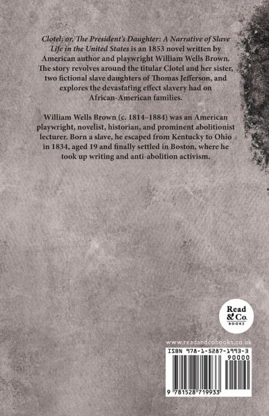"Clotel; or, The President's Daughter: A Narrative of Slave Life in the United States" is an 1853 novel written by American author and playwright William Wells Brown. The story revolves around the titular Clotel and her sister, two fictional slave daughters of Thomas Jefferson, and explores the devastating effect slavery had on African-American families. William Wells Brown (c. 1814-1884) was an American playwright, novelist, historian, and prominent abolitionist lecturer. Born a slave, he escaped from Kentucky to Ohio in 1834, aged 19 and finally settled in Boston, where he took up writing and anti-abolition activism. A compelling examination of life as an African-American slave, "Clotel", is not to be missed by those with an interest in African-American literature and history. Read & Co. Classics is proudly republishing this novel now complete with the poem "Fling out the Anti-Slavery Flag" by the author.