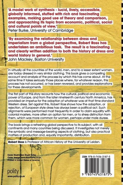 The first part of this story recounts how the cultural, political and economic power of Europe and, from the later nineteenth century North America, has provided an impetus for the adoption of whatever was at that time standard Western dress. Set against this, Robert Ross shows how the adoption of European style dress, or its rejection, has always been a political act, performed most frequently in order to claim equality with colonial masters, more often a male option, or to stress distinction from them, which women, perhaps under male duress, more frequently did.