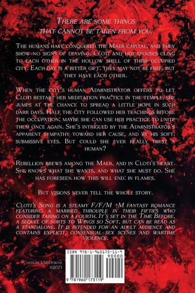 There are some things that cannot be taken from you. The humans have conquered the Maer capital, and they show no signs of leaving. Cloti and her spouses cling to each other in the hollow shell of their occupied city. Each day is a bitter gift; they may not be free, but they have each other. When the city's human Administrator offers to let Cloti restart her meditation practice in the temple, she jumps at the chance to spread a little hope in such dark days. Half the city followed her teachings before the occupation; maybe she can use her practice to unite them once again. She's intrigued by the Administrator's apparent sympathy toward her cause, and by his soft, submissive eyes. But could she ever really trust a human? Rebellion brews among the Maer, and in Cloti's heart. She knows what she wants, and what she must do. She has foreseen how this will end: in flames. But visions never tell the whole story. Cloti's Song is a steamy F/F/M +M fantasy romance featuring a married throuple in their fifties who consider taking on a fourth. It's set in the Time Before, a sequel of sorts to Wings so Soft, but can be read as a standalone. It is intended for an adult audience and contains explicit, consensual sex scenes and wartime violence.