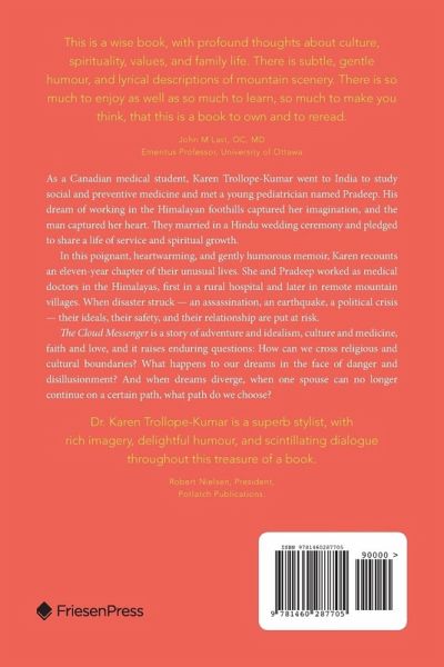 As a Canadian medical student, Karen Trollope-Kumar went to India to study social and preventive medicine and met a young pediatrician named Pradeep. His dream of working in the Himalayan foothills captured her imagination, and the man captured her heart. They married in a Hindu wedding ceremony and pledged to share a life of service and spiritual growth. In this poignant, heartwarming, and gently humorous memoir, Karen recounts an eleven-year chapter of their unusual lives. She and Pradeep worked as medical doctors in the Himalayas, first in a rural hospital and later in remote mountain villages. When disaster struck - an assassination, an earthquake, a political crisis - their ideals, their safety, and their relationship are put at risk. The Cloud Messenger is a story of adventure and idealism, culture and medicine, faith and love, and it raises enduring questions: How can we cross religious and cultural boundaries? What happens to our dreams in the face of danger and disillusionment? And when dreams diverge, when one spouse can no longer continue on a certain path, what path do we choose?