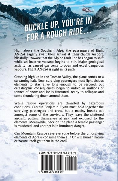 Flight AN224 crashes high up in the Tasman Valley in the Mount Cook National Park, in New Zealand. With many dead and injured, rescue operations are thwarted by bad weather, freezing temperatures and poor visibility. Seismic activity, earthquakes and avalanches continually threaten the passengers while they wait to be rescued. With every new tremor brings with it more danger. The Alpine fault line has destabilized and millions of tonnes of snow and ice, now fractured have become volatile and are ready to come thundering down the mountains that surround them. Captain Benjamin Flynn, with the help from Mountain Rescue, must hold together the surviving passengers and crew while they agonizingly wait for their turn to be airlifted to safety. Time is of the essence, however, some passengers will not wait to be rescued and head down the valley on foot, into perilous conditions. Amidst all the carnage of the crash, a female passenger is murdered and her partner is also at risk. Will Captain Flynn and Mountain Rescue save everyone onboard before the unforgiving elements of Aoraki consume the majestic Airbus? Time is running out.