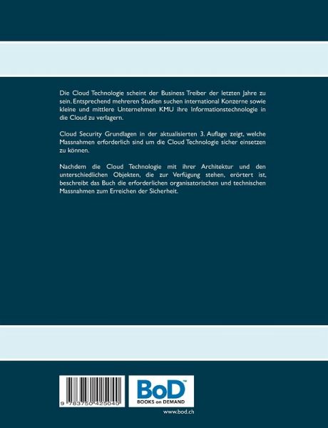 Die Cloud Technologie scheint der Business Treiber der letzten Jahre zu sein. Entsprechend mehreren Studien suchen international Konzerne sowie kleine und mittlere Unternehmen KMU ihre Informationstechnologie in die Cloud zu verlagern.Cloud Security Grundlagen in der aktualisierten 3. Auflage zeigt, welche Massnahmen erforderlich sind um die Cloud Technologie sicher einsetzen zu können.Nachdem die Cloud Technologie mit ihrer Architektur und den unterschiedlichen Objekten, die zur Verfügung stehen, erörtert ist, beschreibt das Buch die erforderlichen organisatorischen und technischen Massnahmen zum Erreichen der Sicherheit.