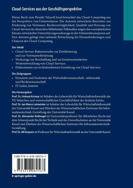 Prof. Dr. Helmut Krcmar ist Inhaber des Lehrstuhls für Wirtschaftsinformatik der TU München und wissenschaftlicher Geschäftsführer des Instituts fortiss. Prof. Dr. Jan Marco Leimeister ist Inhaber des Lehrstuhls für Wirtschaftsinformatik der Universität Kassel und Direktor des Wissenschaftlichen Zentrums für Informationstechnik-Gestaltung der Universität Kassel. Prof. Dr. Alexander Roßnagel ist Universitätsprofessor für öffentliches Recht mit dem Schwerpunkt Recht der Technik und des Umweltschutzes an der Universität Kassel und Direktor des Wissenschaftlichen Zentrums für Informationstechnik-Gestaltung. Prof. Dr. Ali Sunyaev ist Professor für Wirtschaftsinformatik an der Universität Kassel.