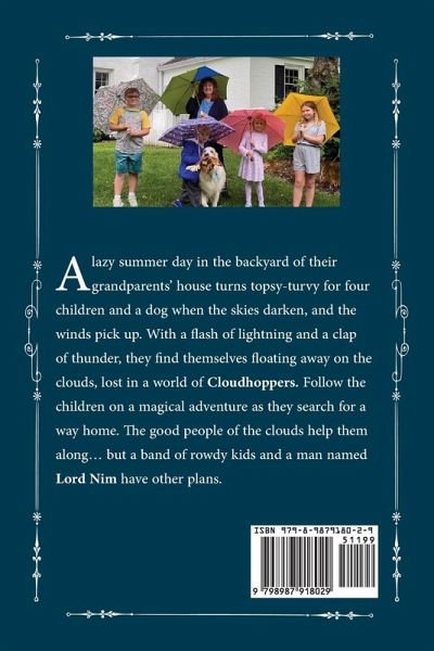 A lazy summer day in the backyard of their grandparents' house turns topsy-turvy for four children and a dog when the skies darken, and the winds pick up. With a flash of lightning and a clap of thunder, they find themselves floating away on the clouds, lost in a world of Cloudhoppers. Follow the children on a magical adventure as they search for a way home. The good people of the clouds help them along ... but a band of rowdy kids and a man named Lord Nim have other plans.