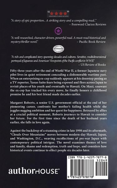 Read the Foreword Clarion book review of Clouds Over Mountains. Fifty three years after the end of World War II, Yasuo Saito lives in quiet retirement concealing his shameful past as a Japanese navy pilot. Margaret Roberts, a senior U.S. government official at the end of her pioneering career, confronts her mother's failing health while she juggles nagging ambition and her quest for happiness. Saito and Roberts each take refuge in Hawaii, where they help the FBI solve a mysterious shooting in Pearl Harbor. As that murder investigation unfolds, hidden stories are revealed that link Saito and Roberts to December 7, 1941, a day of infamy that pushed the world into war and would prove pivotal to both of them. Against the backdrop of a shocking crime in late 1998, "Clouds Over Mountains" moves between modern-day Hawaii, Japan, and Washington, D.C., weaving recollections of pre-war Japan with contemporary political intrigue. The novel examines themes of love and family, shame and redemption, truth and hope, and how historical events continue to shape people's lives six decades later.