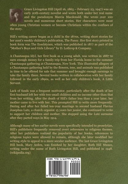 Grace Livingston Hill (April 16, 1865 – February 23, 1947) was an early 20th-century novelist and wrote both under her real name and the pseudonym Marcia Macdonald. She wrote over 100 novels and numerous short stories. Her characters were most often young Christian women or become Christians within the confines of the story. Hill's writing career began as a child in the 1870s, writing short stories for her aunt's weekly children's publication, The Pansy. Her first story printed in book form was The Esselstynes, which was published in 1877 as part of the "Mother's Boys and Girls Library" by D. Lothrop & Company. A Chautauqua Idyl, her first book as a young adult, was written in 1887 to earn enough money for a family trip from her Florida home to the summer Chautauqua gathering at Chautauqua, New York. This illustrated allegory of a Chautauqua gathering held by the flowers, tree, and animals was published in time to be offered for sale that summer and brought enough earnings to take the family there. Several books written in collaboration with her family followed in the early 1890s, as well as her only children's book, A Little Servant. Lack of funds was a frequent motivator, particularly after the death of her first husband left her with two small children and no income other than that from her writing. After the death of Hill's father less than a year later, her mother came to live with her. This prompted Hill to write more frequently. During and after her failed ten-year marriage to second husband Flavius Josephus Lutz, a church organist 15 years her junior, she continued to write to support her children and mother. She stopped using the Lutz surname after they parted ways in May 1914. Although many of her earlier novels were specifically intended to proselytize, Hill's publishers frequently removed overt references to religious themes. After her publishers realized the popularity of her books, references to religious topics were allowed to remain, although she later modified her writing style to appeal to a more secular audience. The last Grace Livingston Hill book, Mary Arden, was finished by her daughter, Ruth Hill Munce, writing under the name of Ruth Livingston Hill, and published in 1948. (wikipedia.org)