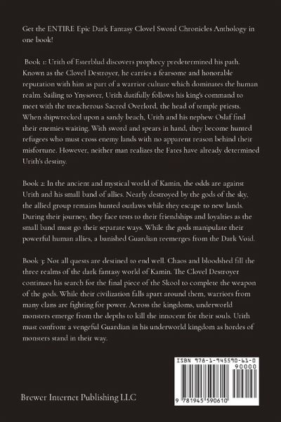 Get the ENTIRE Epic Dark Fantasy Clovel Sword Chronicles Anthology in one book! Book 1: Shield of Skool Book 2: Battle for Three Realms Book 3: Downfall of the Gods Book 1: Urith of Esterblud discovers prophecy predetermined his path. Known as the Clovel Destroyer, he carries a fearsome and honorable reputation with him as part of a warrior culture which dominates the human realm. Sailing to Ynysover, Urith dutifully follows his king's command to meet with the treacherous Sacred Overlord, the head of temple priests.But he doesn't understand the reason for King Penhda to choose him. He is the hard-nosed leader of men in combat, not a diplomat. When shipwrecked upon a sandy beach, Urith and his nephew Oslaf find their enemies waiting. With sword and spears in hand, they become hunted refugees who must cross enemy lands with no apparent reason behind their misfortune. However, neither man realizes the Fates have already determined Urith's destiny. After finding an old friend, Urith discovers that he must seek a weapon of the gods. But adversaries know of the prophecy as well, and they want the power that comes from the Skool. Even the brutal gods join in the quest, creating deadly encounters for Urith and his comrades. Urith learns that honor is gone, trust is nebulous, and his opponents ruthless in the hunt for the Shield of Skool. Book 2: The Battle for Three Realms begins. In the ancient and mystical world of Kamin, the odds are against Urith and his small band of allies. Nearly destroyed by the gods of the sky, the allied group remains hunted outlaws while they escape to new lands. During their journey, they face tests to their friendships and loyalties as the small band must go their separate ways. Oslaf finds common cause with a young ruler of Vulthnal, only to have his ideals of warrior honor dashed when he becomes part of a brutal village massacre. Urith and Fedelm divert their search for the Skool to find their demigod companion, Mivraa, who endures the brutality of her brother gods. While the gods manipulate their powerful human allies, a banished Guardian reemerges from the Dark Void. The ancient deity unleashes fearsome monsters upon the innocent people, seeking to disrupt the delicate balance between gods and humanity. Only the growing power inside the Shield of Skool, carried by a hunted warrior, can stop the slaughter. Book 3: Not all quests are destined to end well. Chaos and bloodshed fill the three realms of the dark fantasy world of Kamin. The Clovel Destroyer continues his search for the final piece of the Skool to complete the weapon of the gods. While their civilization falls apart around them, warriors from many clans are fighting for power following the deaths of two overlords. Across the kingdoms, underworld monsters emerge from the depths to kill the innocent for their souls. The Sacred Overlord now hides inside the Citadel of Br-Ynys while the remnants of an Aberffraw army ravage his kingdom, seeking the man's death. Following the wave of destruction which leads them back to the Citadel, Urith and his followers suffer heartbreak and betrayal. They attempt to confront a vengeful Guardian in his underworld kingdom as hordes of monsters stand in their way. Even if the small group can destroy a god-like creature and close the gateways into the human realm, what awaits the people of Kamin in the aftermath?