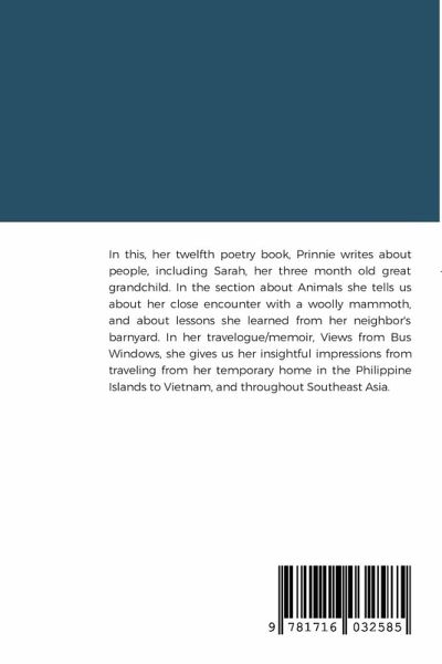 In this, her twelfth poetry book, Prinnie writes about people, including Sarah, her three month old great grandchild. In the section about Animals she tells us about her close encounter with a woolly mammoth, and about lessons she learned from her neighbor's barnyard. In her travelogue/memoir, Views from Bus Windows, she gives us her insightful impressions from traveling from her home in the Philippine Islands to Vietnam, and throughout Southeast Asia.