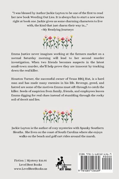 Emma Justice never imagines working at the farmers market on a normal Saturday morning will lead to her second murder investigation. When two friends becomes suspects in the latest small-town murder, she'll help prove they are innocent by tracking down the real killer. Houston Turner, the successful owner of Texas BBQ Hut, is a hard man and has made many enemies in his life. Revenge, greed, and hatred are some of the motives Emma must sift through to catch the killer. Seeds of suspicion from family, friends, and employees leaves Emma digging for real clues instead of stumbling through the rocky soil of deceit and lies.