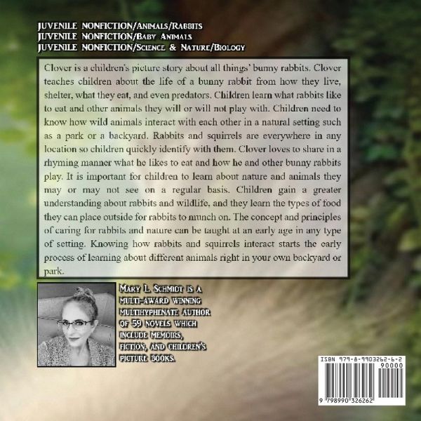 Clover is a children's picture story about all things' bunny rabbits. Clover teaches children about the life of a bunny rabbit from how they live, shelter, what they eat, and even predators. Children learn what rabbits like to eat and other animals they will or will not play with. Children need to know how wild animals interact with each other in a natural setting such as a park or a backyard. Rabbits and squirrels are everywhere in any location so children quickly identify with them. Clover loves to share in a rhyming manner what he likes to eat and how he and other bunny rabbits play. It is important for children to learn about nature and animals they may or may not see on a regular basis. Children gain a greater understanding about rabbits and wildlife, and they learn the types of food they can place outside for rabbits to munch on. The concept and principles of caring for rabbits and nature can be taught at an early age in any type of setting. Knowing how rabbits and squirrels interact starts the early process of learning about different animals right in your own backyard or park.