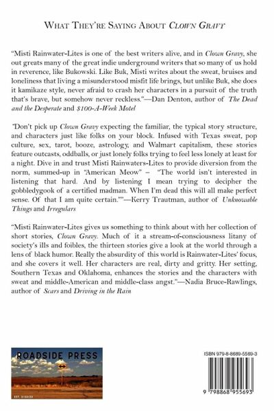 In CLOWN GRAVY, Misti Rainwater-Lites presents a provocative collection of thirteen stories that deftly capture the zeitgeist of the 21st century, where the world appears to be teetering on the brink of chaos, yet there's an undeniable sense of resilience and humor that prevails. Venture into the surreal landscape of CLOWN GRAVY as it explores the horror and hilarity of a society immersed in porno cartoon America, where the boundaries of decency and absurdity blur into a bizarre dance of contradictions. In this literary feast, Rainwater-Lites serves up a Great Value fever dream, where reality and fantasy collide, leaving readers questioning the very fabric of existence. Delve into the allure of celebrity worship and the all-encompassing saturation of social media, which shape and reshape our perceptions of reality in profound ways. Throughout these imaginative tales, pop culture references abound, reflecting the tapestry of influences that surround us, and providing a playful and insightful commentary on our contemporary lives. CLOWN GRAVY is a testament to the times we inhabit, reminding us that despite the challenges we face, there's an underlying spirit that persists-a determination to find humor and solace in the strangest of circumstances. In the end, Misti Rainwater-Lites beckons us to embrace the chaotic beauty of our world, cherishing the moments of absurdity that make life both perplexing and exhilarating. CLOWN GRAVY is an invitation to explore the bizarre, celebrate the unpredictable, and find the silver lining in the most unexpected places. So, let us revel in the "good times" and recognize the unique fortune we have to experience this extraordinary era.