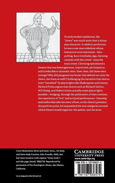 To early modern audiences, the 'clown' was much more than a minor play character. A celebrity performer, he was a one-man sideshow whose interactive entertainments - face-pulling, farce interludes, jigs, rhyming contests with the crowd - were the main event. Clowning epitomized a theatre that was heterogeneous, improvised, participatory, and irreducible to dramatic texts. How, then, did those texts emerge? Why did playgoers buy books that deleted not only the clown, but them as well? Challenging the narrative that clowns were 'banished' by playwrights like Shakespeare and Jonson, Richard Preiss argues that clowns such as Richard Tarlton, Will Kemp, and Robert Armin actually made playwrights possible - bridging, through the publication of their routines, the experience of 'live' and scripted performance. Clowning and Authorship tells the story of how, as the clown's presence decayed into print, he bequeathed the new categories around which theatre would organize: the author, and the actor.