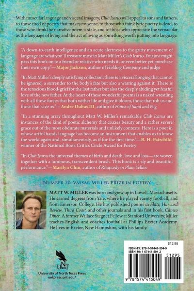 Winner of the Vassar Miller Prize in Poetry, 2012 With muscular language and visceral imagery, Club Icarus will appeal to sons and fathers, to those tired of poetry that makes no sense, to those who think lyric poetry is dead, to those who think the narrative poem is stale, and to those who appreciate the vernacular as the language of living and the act of living as something worth putting into language. "A down-to-earth intelligence and an acute alertness to the gritty movement of language are what you'll treasure most in Matt Miller's Club Icarus. You just might pass this book on to a friend or relative who needs it, or even better yet, purchase their own copy."-Major Jackson, author of Holding Company and judge "In Matt Miller's deeply satisfying collection, there is a visceral longing that cannot be ignored, a surrender to the body's fate but also a warring against it. There is the tenacious blood-grief for the lost father but also the deeply abiding yet fearful love of the new father. At the heart of these wonderful poems is a naked wrestling with all those forces that both wither life and give it bloom, those that rob us and those that save us."-Andre Dubus III, author of House of Sand and Fog "In a stunning array throughout Matt W. Miller's remarkable Club Icarus are instances of the kind of poetic alchemy that coaxes beauty and a rather severe grace out of the most obdurate materials and unlikely contexts. Here is a poet in whose artful hands language has become an instrument that enables us to know the world again and, simultaneously, as if for the first time."-B. H. Fairchild, winner of the National Book Critics Circle Award for Poetry "In Club Icarus the universal themes of birth and death, love and loss-are woven together with a luminous, transcendent brush. This book is a sly and beautiful performance."-Marilyn Chin, author of Rhapsody in Plain Yellow MATT W. MILLER was born and grew up in Lowell, Massachusetts. He earned degrees at Yale, where he also played varsity football, and from Emerson College. He has published poems in Slate, Harvard Review, Third Coast, and other journals and in his first book, Cameo Diner. A former Wallace Stegner Fellow at Stanford University, Miller teaches English and coaches football at Philips Exeter Academy. He lives in Exeter, New Hampshire, with his family.