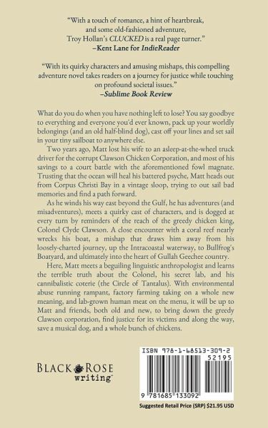 Love a good adventure story-one with sweet old dogs and flawed, yet lovable humans? Hate the idea of factory farming and animal abuse? If so, you're gonna love Clucked! Clucked takes the reader, its bereaved Spam-loving protagonist, and one elderly rat terrier on a wild voyage from Corpus Christi Bay to the Sea Islands. What do you do when you have nothing left to lose? You say goodbye to everything and everyone you'd ever known, pack up your worldly belongings (and an old half-blind dog), cast off your lines and set sail in your tiny sailboat to anywhere else. Two years ago, Matt lost his wife to an asleep-at-the-wheel truck driver for the corrupt Clawson Chicken Corporation, and most of his savings to a court battle with the aforementioned fowl magnate. Trusting that the ocean will heal his battered psyche, Matt heads out from Corpus Christi Bay in a vintage sloop, trying to out sail bad memories and find a path forward. As he winds his way east beyond the Gulf, he has adventures (and misadventures), meets a quirky cast of characters, and is dogged at every turn by reminders of the reach of the greedy chicken king, Colonel Clyde Clawson. A close encounter with a coral reef nearly wrecks his boat, a mishap that draws him away from his loosely-charted journey, up the intracoastal waterway, to Bullfrog's Boatyard, and ultimately into the heart of Gullah Geechee country. Here, Matt meets a beguiling linguistic anthropologist and learns the terrible truth about the Colonel, his secret lab, and his cannibalistic coterie (the Circle of Tantalus). With environmental abuse running rampant and factory farming taking on a whole new meaning, it will be up to Matt and friends, both old and new, to bring down the greedy Clawson corporation, find justice for its victims and along the way, save a musical dog, and a whole bunch of chickens.