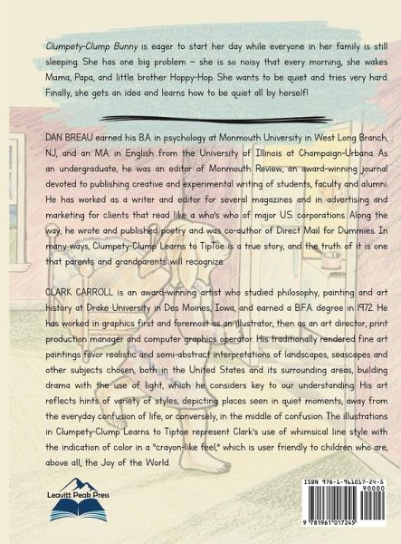 DAN BREAU earned his BA in Psychology at Monmouth University in West Long Branch, NJ, and an MA in English from the University of Illinois at Champaign-Urbana. As an undergraduate, he was an editor of Monmouth Review, an award-winning journal devoted to publishing creative and experimental writing of students, faculty and alumni. He has worked as a writer and editor for several magazines and in advertising and marketing for clients that read like a who's who of major U.S. corporations. Along the way, he wrote and published poetry and was co-author of Direct Mail for Dummies. In many ways, Clumpety-Clump learns to TipToe is a true story, and the truth of it is one that parents and grandparents will recognize.CLARK CARROLL is an award-winning artist who studied philosophy, painting and art history at Drake University in Des Moines, Iowa and earned a BFA degree in 1972. He has worked in graphics first and foremost as an illustrator, then as an art director, print production manager and computer graphics operator. His traditionally rendered fine art paintings favor realistic and semi-abstract interpretations of landscapes, seascapes and other subjects chosen, both in the United States and its surrounding areas, building drama with the use of light, which he considers key to our understanding. His art reflects hints of a variety of styles, depicting places seen in quiet moments, away from the everyday confusion of life, or conversely, in the middle of confusion. The illustrations in Clumpety-Clump Learns to Tiptoe represent Clark's use of whimsical line style with the indication of color in a "crayon-like feel," which is user friendly to children who are, above all, the Joy of the World.